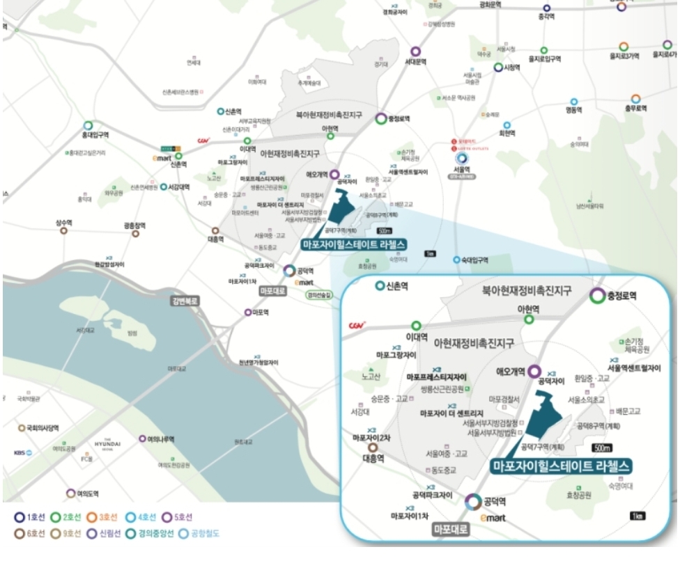 직주근접이 우수한 마포구 일대에서 현재 많은 정비사업이 진행 중이지만, 공덕 1 구역은 그중에서도 입지가 가장 뛰어난 것으로 평가받고 있습니다. 5호선 애오개역의 도보권, 5호선, 6호선, 경의중앙, 공항철도 환승역까지 한 정거장 거리에 있다는 것은 서울 전 지역을 편리하게 이동할 수 있다는 뜻입니다.