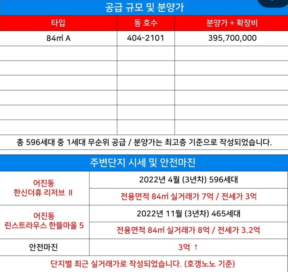 3년 차 아파트로 전용면적 84 기준 실거래가는 7억, 전세가 3억입니다. 분양가 대비 안전마진 3억 정도 생각됩니다. 이번 무순위 줍줍은 404동 2101호 매물이고 최초 분양가 공급이기 때문에 무조건 청약하셔야 합니다.